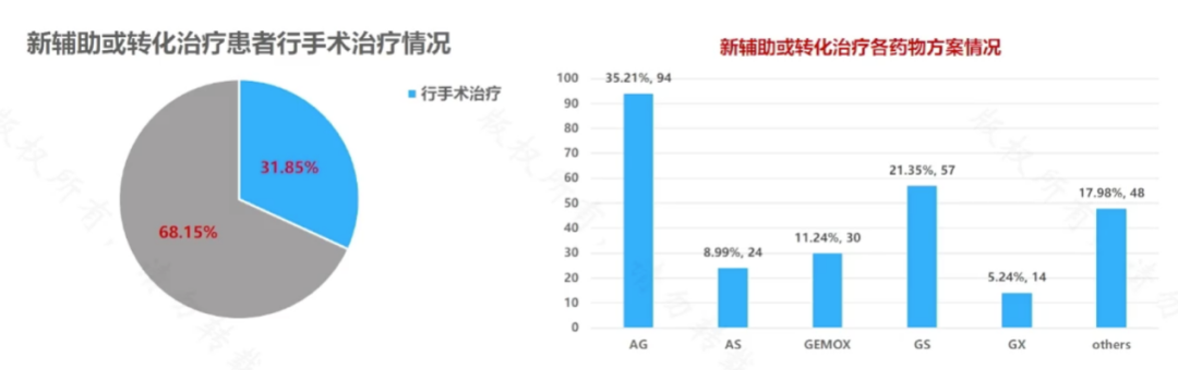 449例患者接受新輔助或轉化治療,143例(31.8%)接受了手術。真實世界新輔助治療方案選擇主要包括AG(35.2%)、GS(21.4%)、GEMOX(11.2%)等方案。