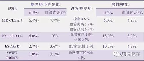 分為5種:①無法到達閉塞區域;②腹股溝並發症;③血管穿刺和剝離;④設備丟失;⑤下遊循環血栓。手術並發症以往並未見過多報道。在早期隊列研究中,隻提及新發並發症,可能還有更多並發症被忽略。近來隨機對照研究報道顯示手術並發症發生率非常低。另外,關於全身麻醉和清醒鎮靜的問題,最近幾項研究數據未能權衡兩種措施的優劣,也未能得出兩種麻醉措施對預後的效果。臨床需要更多數據,目前一項單中心研究正在招募相關病例。