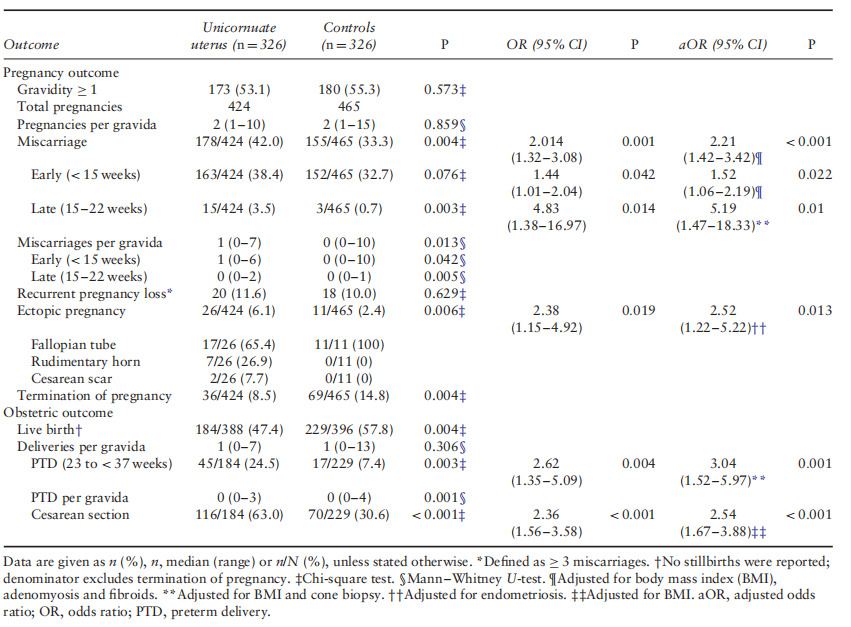 本研究核心結果之一為單角子宮女性的活產率明顯低於對照組。具體數據顯示,單角子宮組的活產率為47.4%,而對照組為57.8%(P=0.004)(表1)。這一結果表明,單角子宮對女性分娩具有負麵影響。