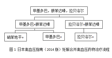 藥物治療推薦用於重度高血壓(SBP>160 mmHg和/或DBP>110 mmHg)(證據Ⅰ);藥物治療也可用於妊娠婦女血壓持續升高≥150/95 mmHg,和合並有亞臨床靶器官損害或症狀,BP≥140/90 mmHg的妊娠期高血壓(證據Ⅱb)。降壓藥物首先考慮甲基多巴、拉貝洛爾、硝苯地平。急診靜脈用藥可考慮拉貝洛爾、硝普鈉。